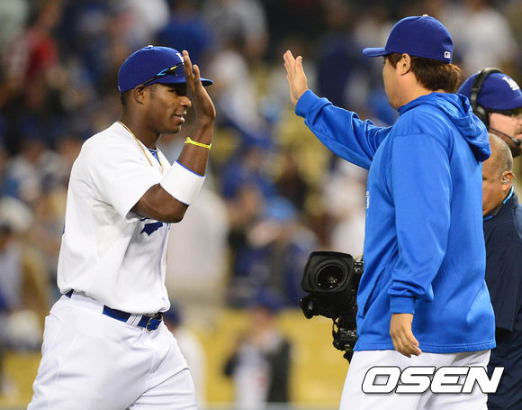 7일 오전(이하 한국시간) 미국 캘리포니아주 로스앤젤레스 다저스타디움에서 열린 LA 다저스와 애틀랜타 브레이브스의 경기 종료 후 우리베와 류현진이 하이파이브를 하고 있다.