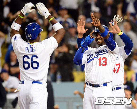 7일 오전(이하 한국시간) 미국 캘리포니아주 로스앤젤레스 다저스타디움에서 열린 LA 다저스와 애틀랜타 브레이브스의 경기 8회말 1사 만루 푸이그가 만루홈런을 친 후 홈에서 라미레스와 하이파이브를 하고 있다.