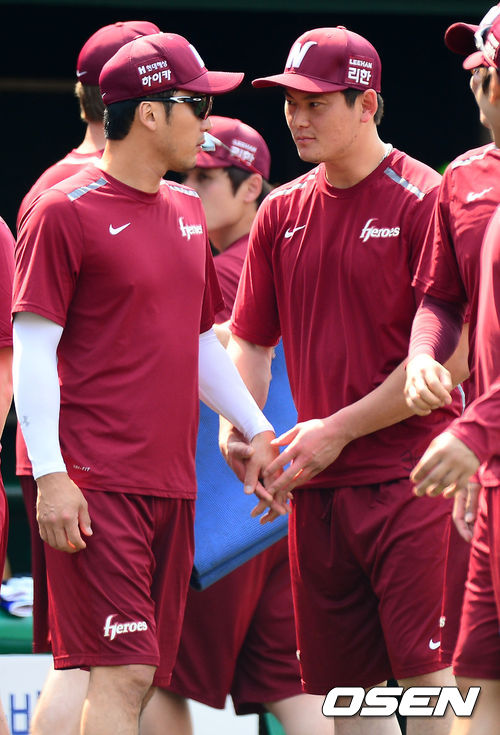7일 오후 서울 목동구장에서 2013 한국야쿠르트 세븐프로야구 넥센 히어로즈와 KIA 타이거즈의 경기가 열릴 예정인 가운데 양 팀 훈련시간에 넥센 이성열이 이택근과 손을 잡으며 얘기를 나누고 있다.