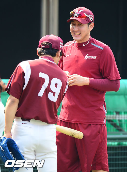 7일 오후 서울 목동구장에서 2013 한국야쿠르트 세븐프로야구 넥센 히어로즈와 KIA 타이거즈의 경기가 열릴 예정인 가운데 양 팀 훈련시간에 넥센 최만호 코치가 배트로 유한준을 장난으로 치고 있다.