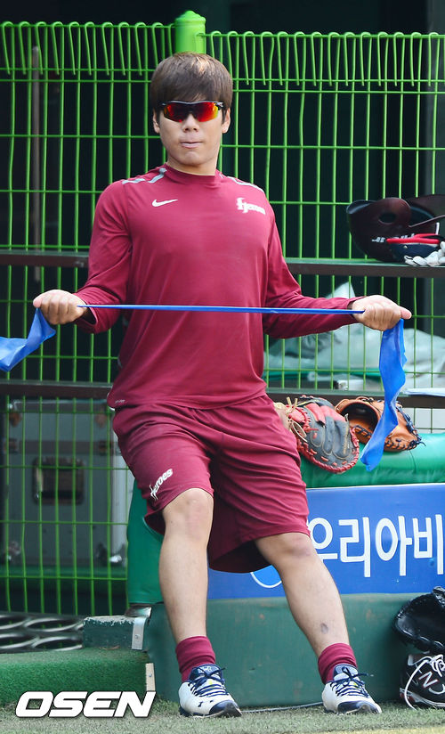 7일 오후 서울 목동구장에서 2013 한국야쿠르트 세븐프로야구 넥센 히어로즈와 KIA 타이거즈의 경기가 열릴 예정인 가운데 양 팀 훈련시간에 넥센 강정호가 튜빙을 하고 있다.