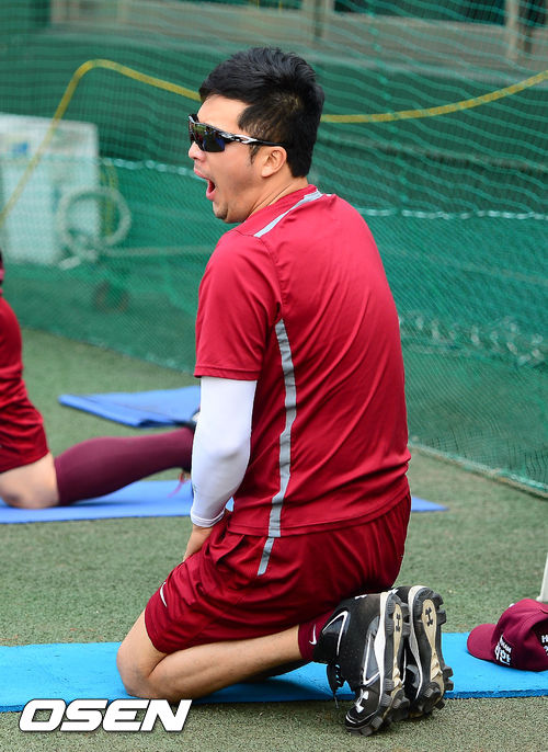 7일 오후 서울 목동구장에서 2013 한국야쿠르트 세븐프로야구 넥센 히어로즈와 KIA 타이거즈의 경기가 열릴 예정인 가운데 양 팀 훈련시간에 넥센 이택근이 하품을 하고 있다.