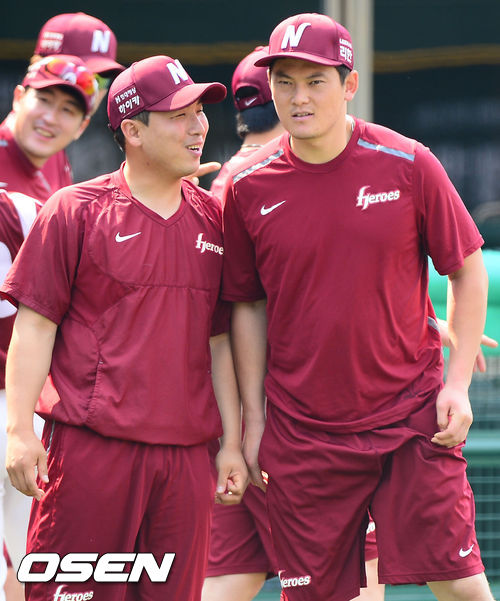 7일 오후 서울 목동구장에서 2013 한국야쿠르트 세븐프로야구 넥센 히어로즈와 KIA 타이거즈의 경기가 열릴 예정인 가운데 양 팀 훈련시간에 넥센 허도환이 이성열과 얘기를 나누고 있다.