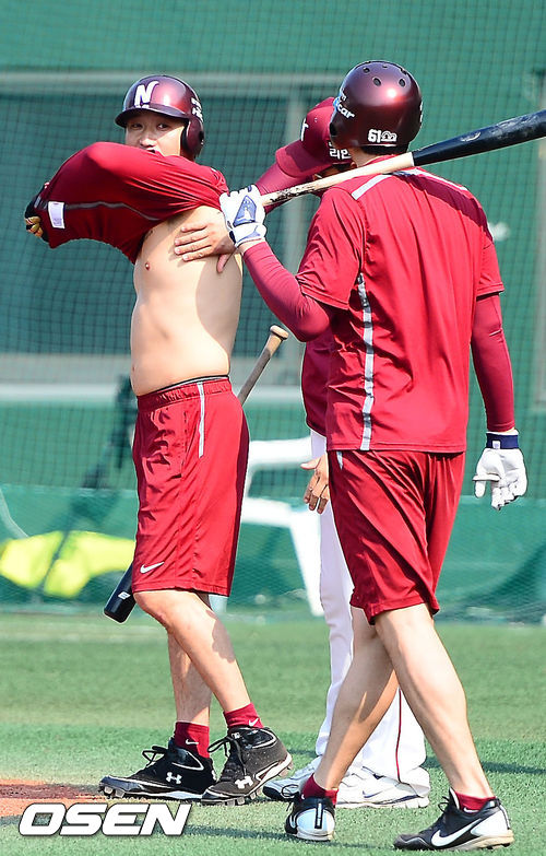 7일 오후 서울 목동구장에서 2013 한국야쿠르트 세븐프로야구 넥센 히어로즈와 KIA 타이거즈의 경기가 열릴 예정인 가운데 양 팀 훈련시간에 넥센 이택근이 어제 삼성과의 경기에서 7회말 1사 1루 심창민에게 볼을 맞은 자리를 보여주고 있다.