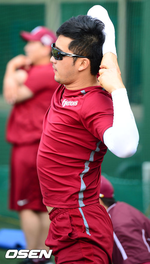 7일 오후 서울 목동구장에서 2013 한국야쿠르트 세븐프로야구 넥센 히어로즈와 KIA 타이거즈의 경기가 열릴 예정인 가운데 양 팀 훈련시간에 넥센 이택근이 몸을 풀고 있다.