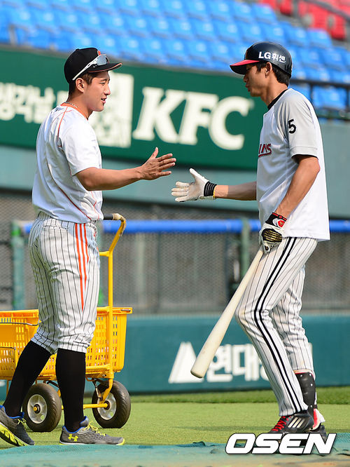 7일 오후 잠실야구장에서 열린 '2013 한국야쿠르트 세븐 프로야구' LG 트윈스와 롯데 자이언츠의 경기, 경기에 앞서 롯데 황재균과 LG 김용의가 인사를 나누고 있다.