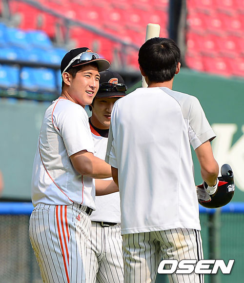 7일 오후 잠실야구장에서 열린 '2013 한국야쿠르트 세븐 프로야구' LG 트윈스와 롯데 자이언츠의 경기, 경기에 앞서 롯데 황재균이 LG 김용의의 배트를 들고 이야기를 나누고 있다.