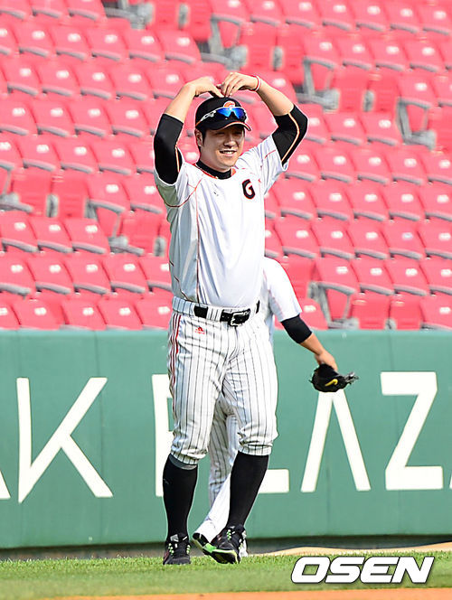 7일 오후 잠실야구장에서 열린 '2013 한국야쿠르트 세븐 프로야구' LG 트윈스와 롯데 자이언츠의 경기, 경기에 앞서 롯데 강민호가 LG 김무관 코치를 향해 하트를 그리며 인사를 하고 있다.