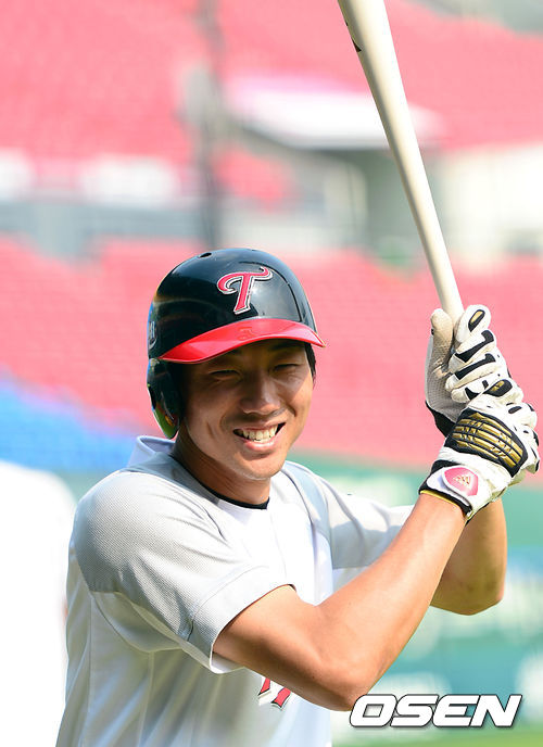 7일 오후 잠실야구장에서 열린 '2013 한국야쿠르트 세븐 프로야구' LG 트윈스와 롯데 자이언츠의 경기, 경기에 앞서 LG 김용의가 타격 훈련 중 미소를 짓고 있다.