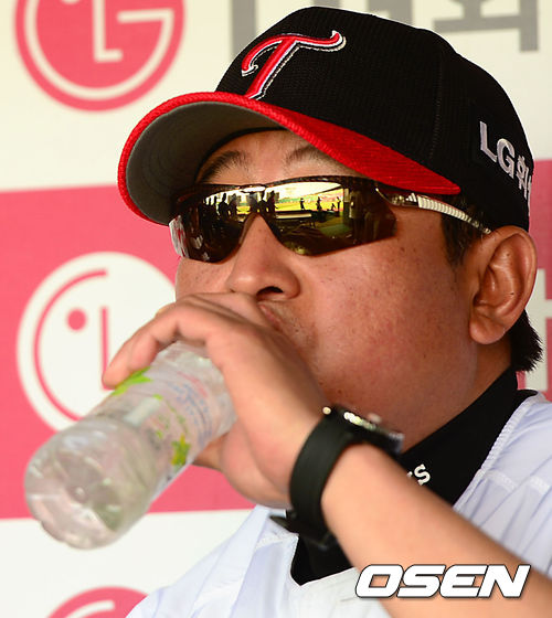 7일 오후 잠실야구장에서 열린 '2013 한국야쿠르트 세븐 프로야구' LG 트윈스와 롯데 자이언츠의 경기, 경기에 앞서 LG 김기태 감독이 덕아웃에서 물을 마시고 있다.
