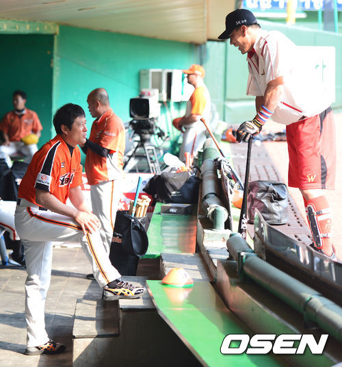 7일 오후 인천 문학구장에서 열리는 '2013 한국야쿠르트 세븐 프로야구' SK 와이번스 대 한화 이글스의 경기를 앞두고 한화 이종범 코치와 SK 김상현이 인사를 나누고 있다.