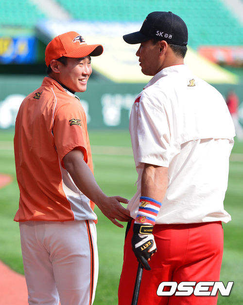 7일 오후 인천 문학구장에서 열리는 '2013 한국야쿠르트 세븐 프로야구' SK 와이번스 대 한화 이글스의 경기를 앞두고 SK 김상현과 한화 김광수가 인사를 나누고 있다.