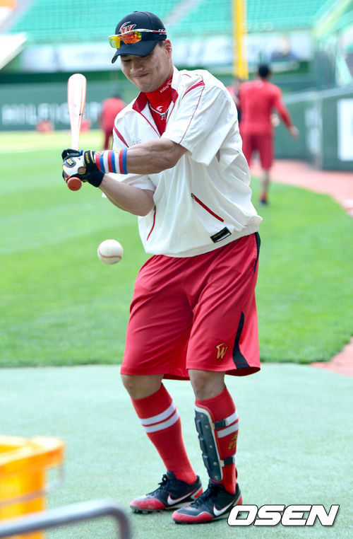 7일 오후 인천 문학구장에서 열리는 '2013 한국야쿠르트 세븐 프로야구' SK 와이번스 대 한화 이글스의 경기를 앞두고 SK 김상현이 타격연습을 하고 있다.