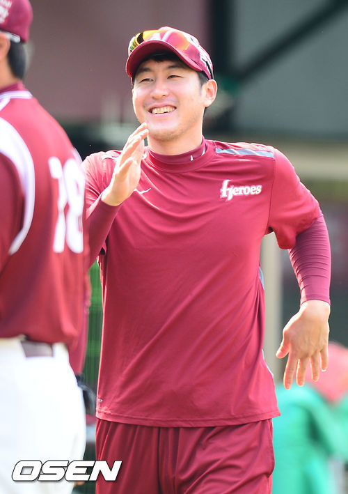 7일 오후 서울 목동구장에서 2013 한국야쿠르트 세븐프로야구 넥센 히어로즈와 KIA 타이거즈의 경기가 열릴 예정인 가운데 양 팀 훈련시간에 넥센 유한준이 환한 미소로 뛰어나오고 있다.
