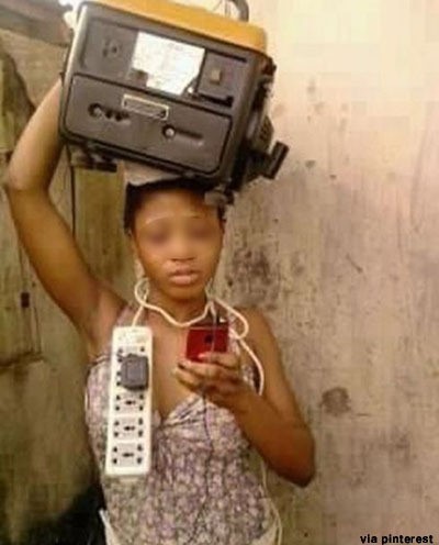 엄청난 크기의 발전기를 머리에 얹고 있어 무게가 상당해 보이지만 여성은 태연하게 휴대폰을 사용하고 있다. 사진 속 여성은 한 손으로는 휴대용 발전기를 지탱하고 목에 멀티탭을 감은 채 휴대폰을 바라보고 있다.
