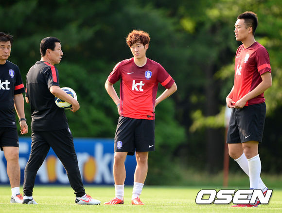 최강희 감독이 손흥민, 김신욱과 이야기를 나누고 있다.