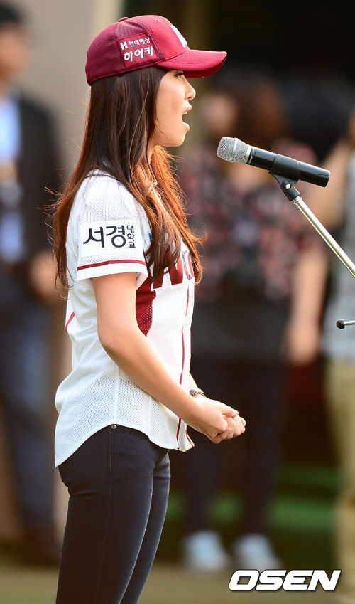 7일 오후 서울 목동구장에서 2013 한국야쿠르트 세븐프로야구 넥센 히어로즈와 KIA 타이거즈의 경기가 열릴 예정인 가운데 경기 전 뮤지컬 배우 선우가 시구전 애국가를 열창하고 있다.