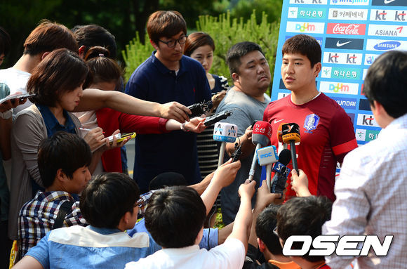 훈련에 앞서 박주호가 취재진에 둘러싸여 인터뷰를 하고 있다.