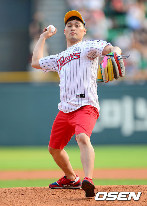 7일 오후 잠실야구장에서 열린 '2013 한국야쿠르트 세븐 프로야구' LG 트윈스와 롯데 자이언츠의 경기, 경기에 앞서 개그맨 송준근이 시구를 하고 있다.