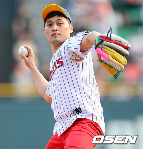 7일 오후 잠실야구장에서 열린 '2013 한국야쿠르트 세븐 프로야구' LG 트윈스와 롯데 자이언츠의 경기, 경기에 앞서 개그맨 송준근이 시구를 하고 있다.