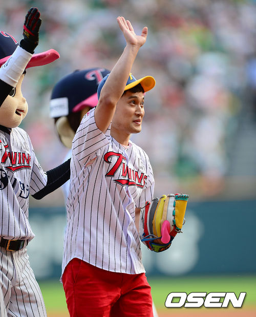 7일 오후 잠실야구장에서 열린 '2013 한국야쿠르트 세븐 프로야구' LG 트윈스와 롯데 자이언츠의 경기, 경기에 앞서 개그맨 송준근이 시구를 하고 있다.