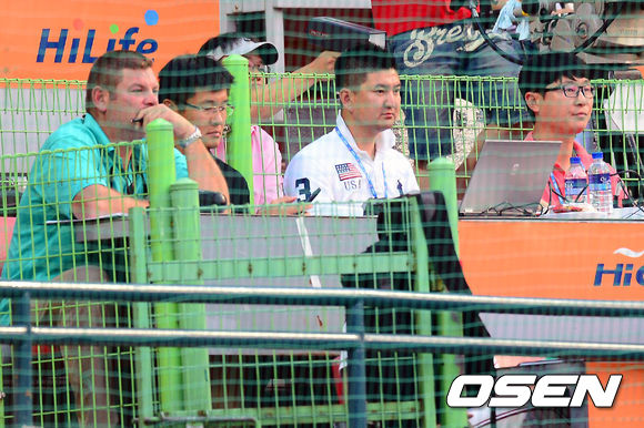7일 오후 서울 목동구장에서 열린 2013 한국야쿠르트 세븐프로야구 넥센 히어로즈와 KIA 타이거즈의 경기에서 ML 스카우터들이 경기를 주시하고 있다.