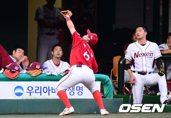 7일 오후 서울 목동구장에서 열린 2013 한국야쿠르트 세븐프로야구 넥센 히어로즈와 KIA 타이거즈의 경기에서 3회말 1사 주자 3루 넥센 서건창의 타구를 KIA 3루수 박기남이 달려가 잡아내고 있다.