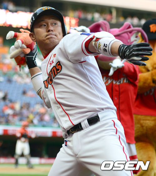 7일 오후 인천 문학구장에서 '2013 한국야쿠르트 세븐 프로야구' SK 와이번스 대 한화 이글스의 경기가 열렸다. 2회말 SK 공격 선두타자로 나선 9번 박경완이 좌월 솔로포를 터트리고 선물받은 인형을 관중석을 향해 던지고 있다.