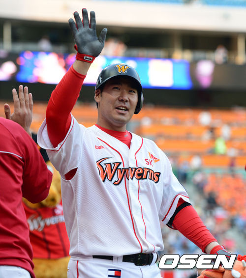 7일 오후 인천 문학구장에서 '2013 한국야쿠르트 세븐 프로야구' SK 와이번스 대 한화 이글스의 경기가 열렸다. 1회말 SK 공격 무사 1, 2루 상황 4번 이재원이 한화 선발 김혁민을 상대로 중월 스리런포를 터트리고 동료들과 인사를 나누고 있다.