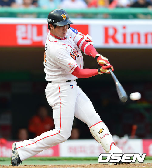 7일 오후 인천 문학구장에서 '2013 한국야쿠르트 세븐 프로야구' SK 와이번스 대 한화 이글스의 경기가 열렸다. 1회말 SK 공격 무사 1, 3루 상황 3번 최정이 선제 1타점 좌전 적시타를 날리고 있다.