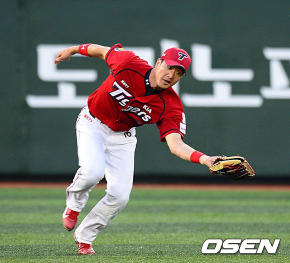 7일 오후 서울 목동구장에서 열린 2013 한국야쿠르트 세븐프로야구 넥센 히어로즈와 KIA 타이거즈의 경기, 4회말 넥센 선두타자 이택근의 타구를 KIA 좌익수 김주찬이 잡아내고 있다.