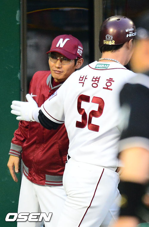 7일 오후 서울 목동구장에서 열린 2013 한국야쿠르트 세븐프로야구 넥센 히어로즈와 KIA 타이거즈의 경기, 4회말 1사 주자 없는 상황에서 넥센 박병호가 우월 동점 솔로홈런을 날린 후 염경엽 감독과 하이파이브를 하고 있다.