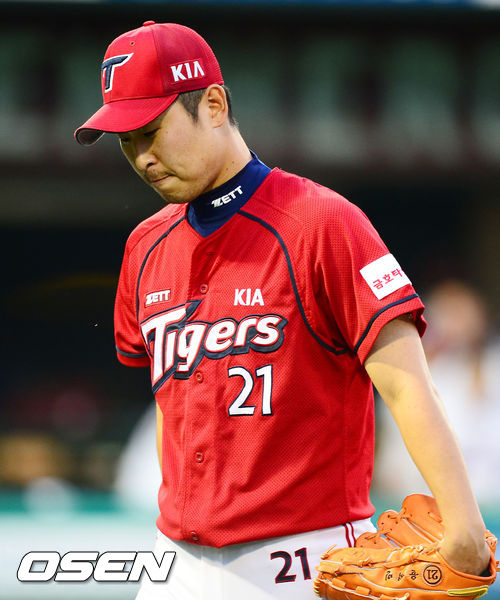 7일 오후 서울 목동구장에서 열린 2013 한국야쿠르트 세븐프로야구 넥센 히어로즈와 KIA 타이거즈의 경기, 4회말을 마친 KIA 선발 윤석민이 동점 홈런을 허용한 것에 대해 아쉬움을 삼키며 덕아웃으로 들어오고 있다.