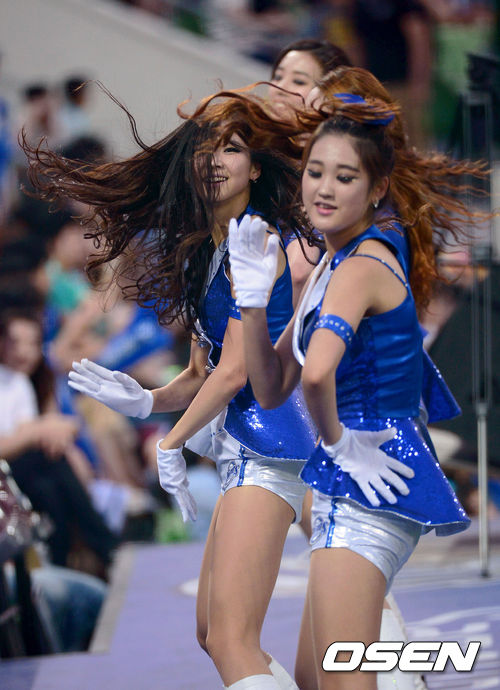 7일 오후 대구구장에서 열린 '2013 한국야쿠르트 세븐 프로야구' 삼성 라이온즈 와 두산 베어스 경기, 삼성 치어리더들이 흥겨운 음악에 맞춰 댄스를 선보이고 있다.