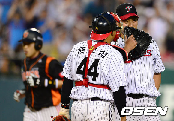 7일 오후 잠실야구장에서 열린 '2013 한국야쿠르트 세븐 프로야구' LG 트윈스와 롯데 자이언츠의 경기, 5회초 2사에서 롯데 전준우에게 좌월 솔로 홈런을 허용한 LG 류제국이 포수 윤요섭과 이야기를 나누고 있다.