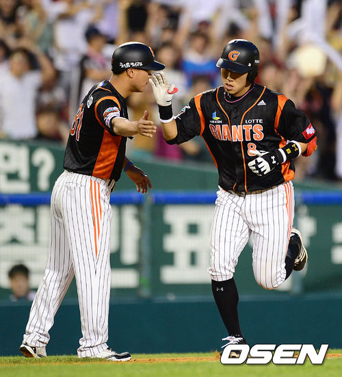 7일 오후 잠실야구장에서 열린 '2013 한국야쿠르트 세븐 프로야구' LG 트윈스와 롯데 자이언츠의 경기, 5회초 2사에서 롯데 전준우가 좌월 솔로 홈런을 치고 박현승 코치와 하이파이브를 하고 있다.