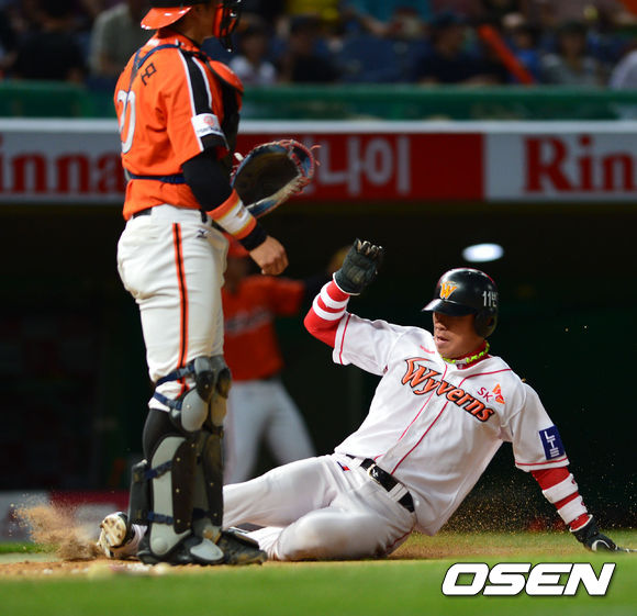 7일 오후 인천 문학구장에서 '2013 한국야쿠르트 세븐 프로야구' SK 와이번스 대 한화 이글스의 경기가 열렸다. 6회말 SK 공격 1사 3루 상황 1번 조동화의 좌익수 희생플라이 때 주자 박정권이 태그업해 홈에 들어오고 있다.
