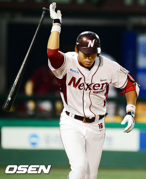7일 오후 서울 목동구장에서 열린 2013 한국야쿠르트 세븐프로야구 넥센 히어로즈와 KIA 타이거즈의 경기, 5회말 2사 주자 1,2루 넥센 강정호가 좌월 역전 스리런 홈런을 날린 후 배트를 던지고 있다.