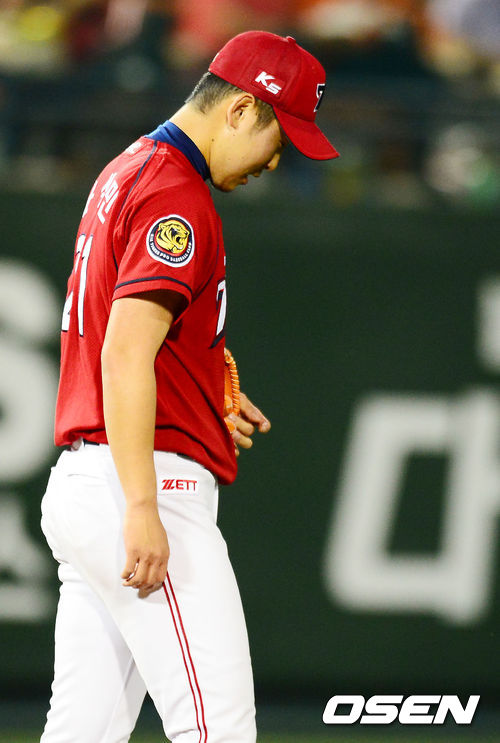 7일 오후 서울 목동구장에서 열린 2013 한국야쿠르트 세븐프로야구 넥센 히어로즈와 KIA 타이거즈의 경기, 5회말 2사 주자 1,2루 넥센 강정호가 좌월 역전 스리런 홈런을 날리자 KIA 선발 윤석민이 마운드 위에서 고개를 떨구고 있다.