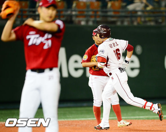 7일 오후 서울 목동구장에서 열린 2013 한국야쿠르트 세븐프로야구 넥센 히어로즈와 KIA 타이거즈의 경기, 5회말 2사 주자 1,2루 넥센 강정호가 좌월 역전 스리런 홈런을 날린 후 그라운드를 돌고 있다.