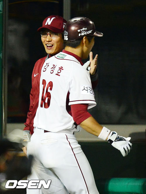 7일 오후 서울 목동구장에서 열린 2013 한국야쿠르트 세븐프로야구 넥센 히어로즈와 KIA 타이거즈의 경기, 5회말 2사 주자 1,2루 넥센 강정호가 좌월 역전 스리런 홈런을 날린 후 덕아웃에서 염경엽 감독과 하이파이브를 하고 있다.