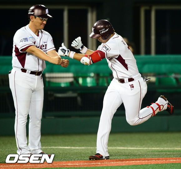 7일 오후 서울 목동구장에서 열린 2013 한국야쿠르트 세븐프로야구 넥센 히어로즈와 KIA 타이거즈의 경기, 5회말 2사 주자 1,2루 넥센 강정호가 좌월 역전 스리런 홈런을 날린 후 3루에서 심재학 코치와 하이파이브를 하고 있다.