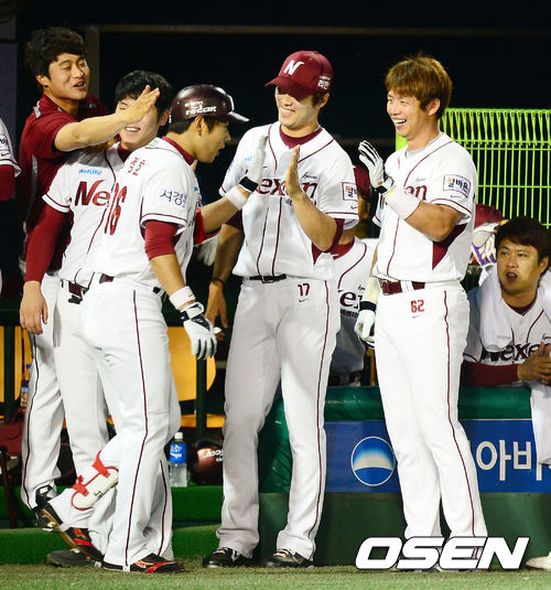 7일 오후 서울 목동구장에서 열린 2013 한국야쿠르트 세븐프로야구 넥센 히어로즈와 KIA 타이거즈의 경기, 5회말 2사 주자 1,2루 넥센 강정호가 좌월 역전 스리런 홈런을 날린 후 덕아웃에서 동료들과 기쁨을 나누고 있다.