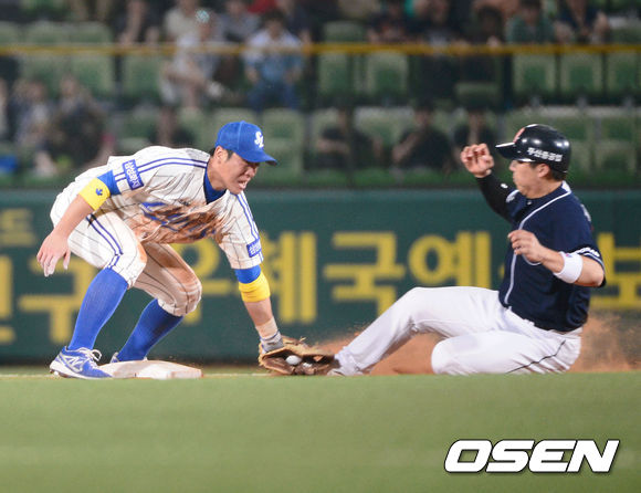 7일 오후 대구구장에서 열린 '2013 한국야쿠르트 세븐 프로야구' 삼성 라이온즈 와 두산 베어스 경기, 6회초 1사 1루 홍성흔 삼진아웃때 1루주자 김현수 2루도루를 하였으나 조동찬에게 태그아웃 처리되고 있다.