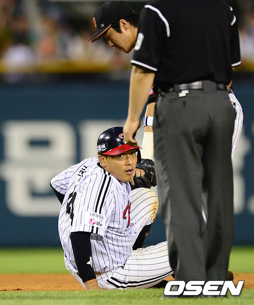 7일 오후 잠실야구장에서 열린 '2013 한국야쿠르트 세븐 프로야구' LG 트윈스와 롯데 자이언츠의 경기, 5회말 무사 2루에서 LG 손주인 타석 때 협살에 걸리 2루주자 윤요섭이 그라운드에 넘어져 롯데 정훈에게 태그아웃을 당하고 있다.