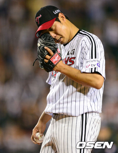 7일 오후 잠실야구장에서 열린 '2013 한국야쿠르트 세븐 프로야구' LG 트윈스와 롯데 자이언츠의 경기, 8회초 무사 만루에서 LG 류제국이 폭투로 실점을 허용하고 아쉬운 표정을 짓고 있다.