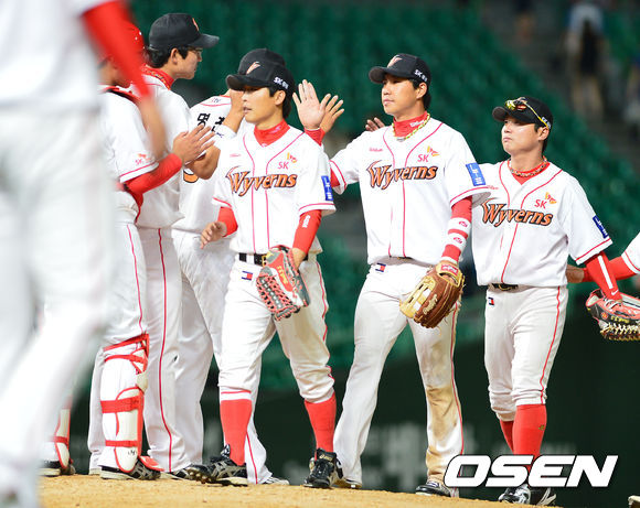 경기 종료 직후 SK 선수들이 마운드에서 하이파이브를 나누고 있다./dreamer@osen.co.kr