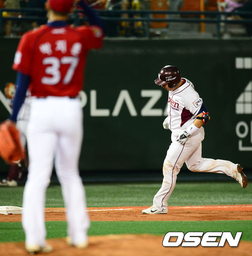 7일 오후 서울 목동구장에서 열린 2013 한국야쿠르트 세븐프로야구 넥센 히어로즈와 KIA 타이거즈의 경기, 8회말 2사 주자 1루 넥센 허도환이 좌월 투런홈런을 날린 후 그라운드를 돌고 있다.