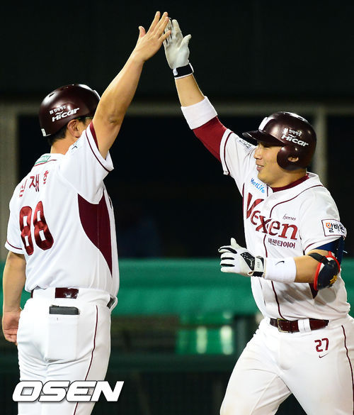 7일 오후 서울 목동구장에서 열린 2013 한국야쿠르트 세븐프로야구 넥센 히어로즈와 KIA 타이거즈의 경기, 8회말 2사 주자 1루 넥센 허도환이 좌월 투런홈런을 날린 후 3루에서 심재학 코치와 하이파이브를 하고 있다.