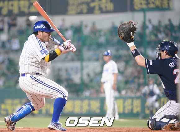 7일 오후 대구구장에서 열린 '2013 한국야쿠르트 세븐 프로야구' 삼성 라이온즈 와 두산 베어스 경기,8회말 2사 2루 박석민 두산 홍상삼 투수의 머리쪽으로 날라오는 공을 피하고 있다.